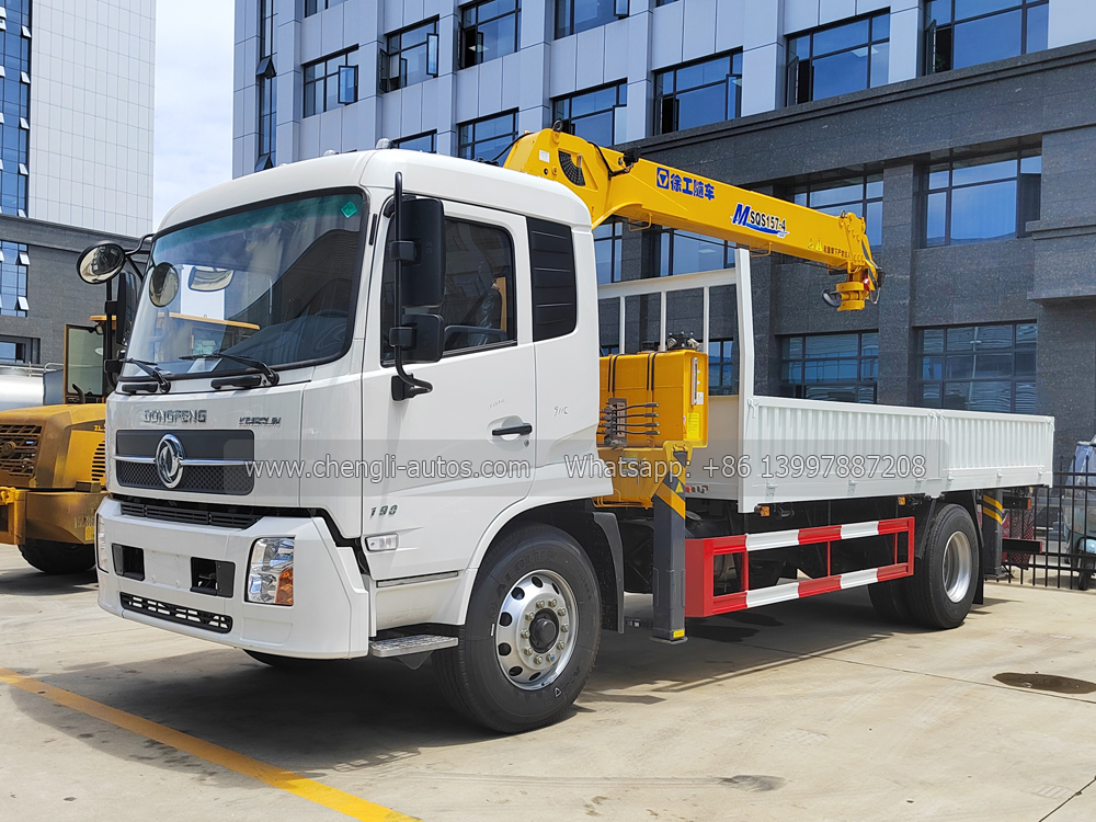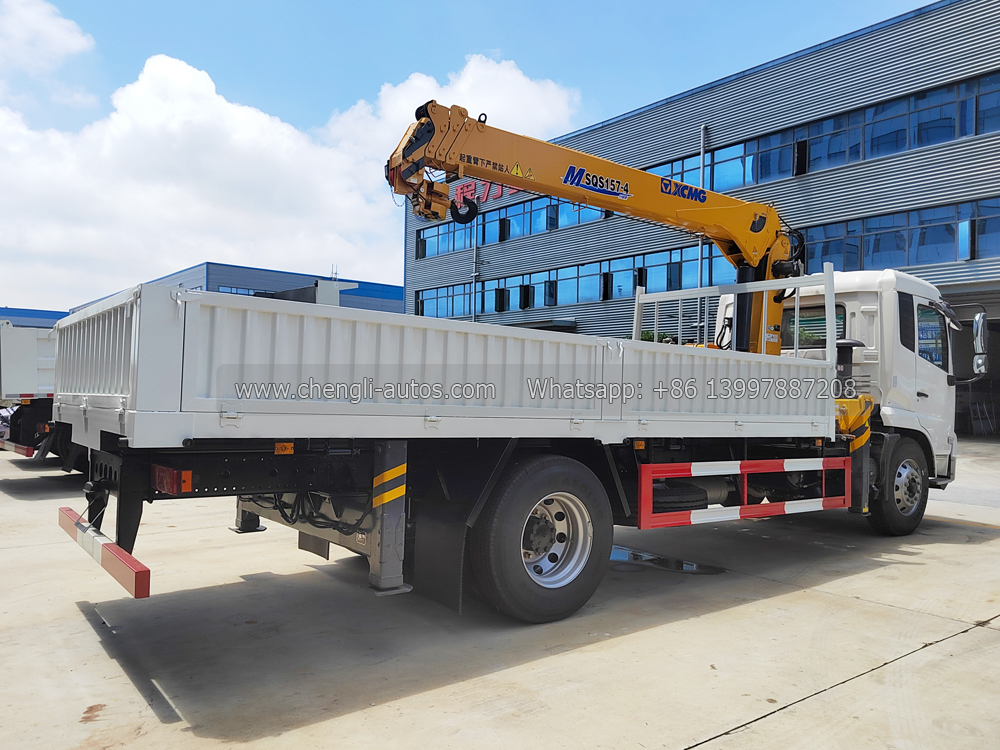 Dongfeng Truck Mounted XCMG Crane (also called XCMG boom crane, Dongfeng cargo truck with crane, SQS157-4 crane truck, truck mounted knuckle crane, XCMG 6.3 tons crane truck, truck cargo with loader, XCMG crane on truck chassis, 4×2 truck mounted crane, which is used to lift the cargo, load, transport and unload heavy stuff.