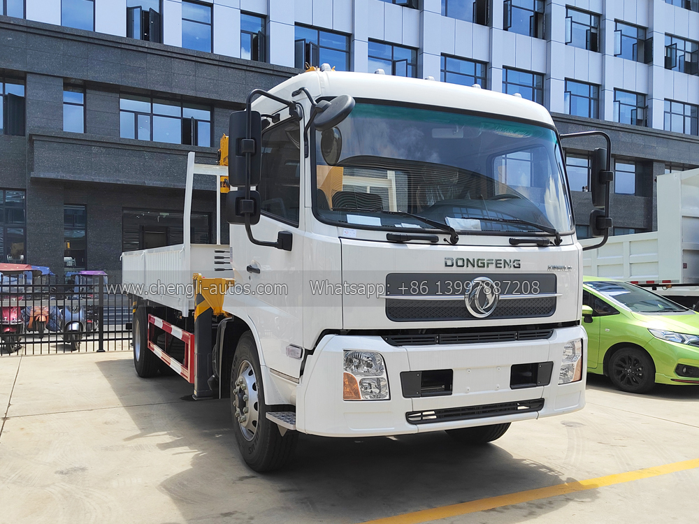 10tons Dongfeng truck with crane, Dongfeng 4x2 chassis, FAST 8-shift manual gearbox, CUMMNS 190HP diesel engine, cargo body size is optional, painting and logos depend on requirements.
