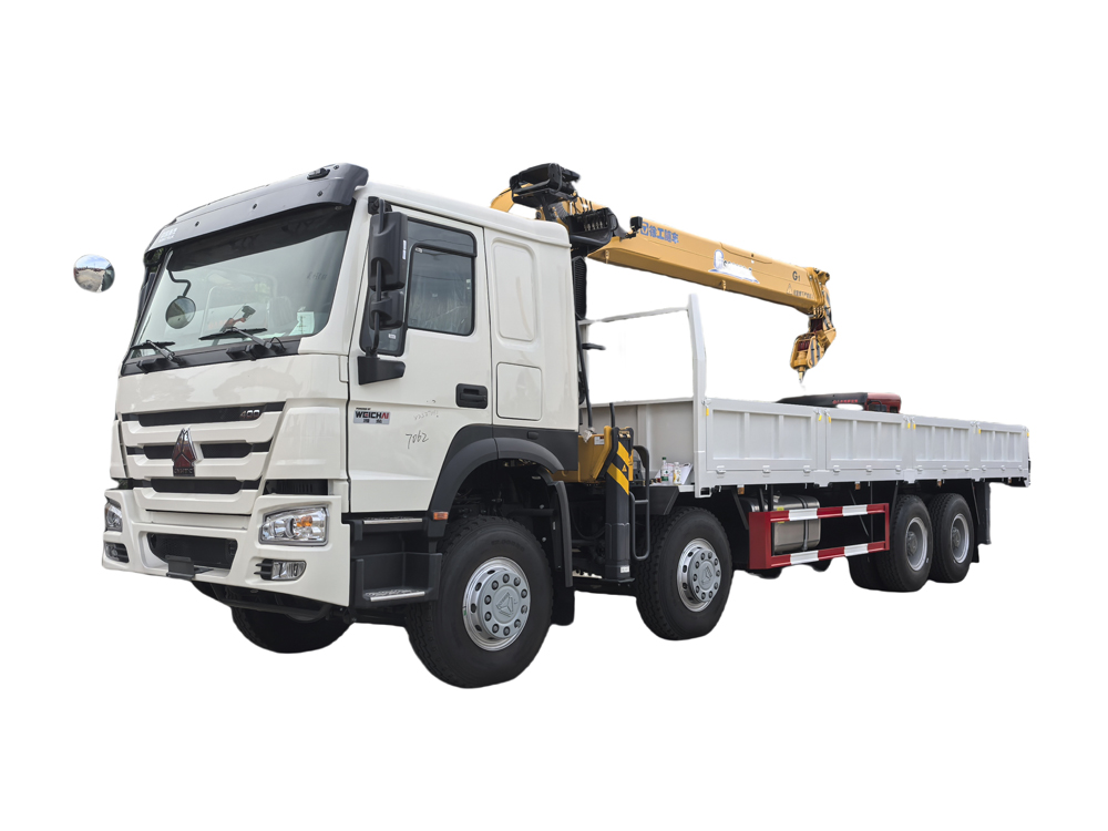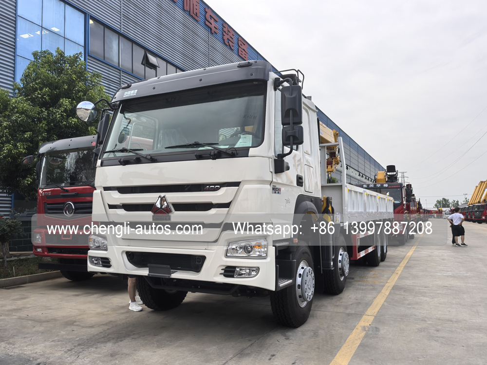 Sinotruk HOWO 400HP Truck Mounted XCMG Crane (also called XCMG telescopic boom crane, Heavy duty dump truck with crane, 25 tons truck mounted knuckle crane, 8x4 heavy duty transport crane, Howo 12 wheels XCMG crane). It is commonly used to transport construction materials, machinery, vehicles, and other large or bulky items. The open design of flatbed trucks allows for easy loading and unloading of cargo using cranes, forklifts, or other equipment.